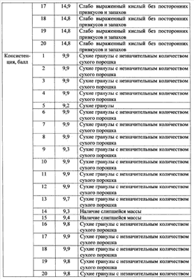 Пример 18. Выполняют по примеру 1, при этом сушку ведут до влажности 5%. Продолжительность процесса сокращается до 4,3 часа. Продолжительность хранения сокращается до 14 месяцев, это объясняется тем, что повышенное содержание влаги является благоприятным условием для более быстрого развития микроорганизмов.