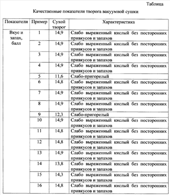 Пример 11. Выполняют по примеру 1, при величине остаточного давления 2 кПа. Качество творога аналогично примеру 1, но процесс сушки протекает при больших затратах энергии.