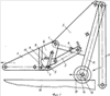 В положении диван с фиксацией шарнирно-рычажного механизма трансформируют механизм в обратном порядке. Поднимают плечо 7 шарнира 1 за прикрепленный к нему элемент мебели (см. фиг.4). При этом упор 5, проскальзывая по планке 2, доходит до флажка 8, отжимает его при помощи пружины кручения 6 и заходит в зацепление с вырезом 4 планки 2. Затем плечо 7 с элементом мебели опускают вниз, при этом упор 5 толкает планку 2, которая перемещает плечо 3 с закрепленным на нем рычаге 12 с роликом 14 по направляющей 16 каркаса мебели. Реборда 15 ролика 14 предохраняет механизм от перекоса. При дальнейшем перемещении опорный рычаг 11 поднимает плечо 3 с закрепленным элементом мебели.