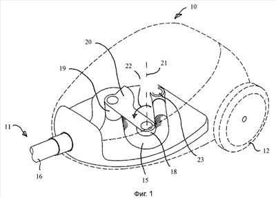 На фиг.1 также показан фитинг 23, например коленчатый патрубок, на конце первой части 15 шланга, закрепленный в корпусе 10, соединяющий часть 15 шланга с каналом воздушного потока, ведущим к конструкции сепаратора/коллектора всасывающего устройства (которая может быть расположена над камерой хранения, вмещающей часть 15 шланга).