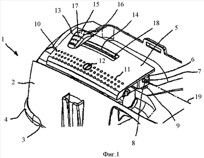 На переднем участке 10 поверхности элемента 5 управления расположено множество полусферических выступов 11, которые не только указывают пользователю поверхность, нажимая на которую, он может перевести элемент 5 управления в положение включения, но и препятствуют соскальзыванию при нажатии на эту пластину. Для опознания функции, которая может быть введена в действие посредством переключения элемента 5 управления, выполненного в виде поворотной пластины, на верхней стороне элемента 5 управления в средней части участка 10 поверхности с полусферическими выступами 11 выполнено возвышение 12 в виде пиктограммы.