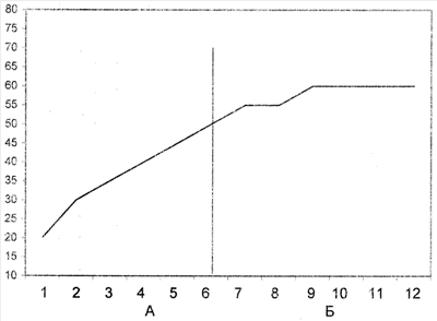 На чертеже изображена диаграмма динамики показателей светобоязни поврежденного глаза по силе светового пучка в острый период (А) – продолжается в среднем с 1 по 6 день после травмы: сила светового пучка от 20 люкс в первый день до 50 люкс на 6 день после травмы и подострый период (Б) – продолжается с 7 дня после травмы: сила светового пучка от 50 люкс на 7 день до 60 люкс на 12 день после травмы. По вертикали диаграммы представлены показатели светобоязни по силе светового пучка в люкс, по горизонтали – дни после травмы.