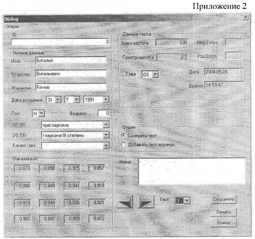 Пользователь (врач) при работе с компьютером при обследовании центрального поля зрения выполняет на нем следующие действия: просмотр базы данных, ввод данных, который осуществляют либо при выполнении программы тестирования, либо вручную; обновление данных о пациенте в течение длительного времени обследования, удаление данных о пациенте; экспорт данных. Диалоговое окно для работы с базой данных и диалоговое окно при проведении тестирования пациента указаны в приложениях 1 и 2.