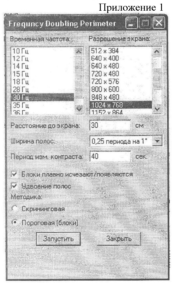 Пороговая методика обследования требует выполнения строгих условий к работе программы. Ужесточение обуславливается тем, что на фоне замены кадров с временной частотой, обеспечивающей получение иллюзии удвоения низкой пространственной частоты, необходимо обеспечить изменение яркости изображения. Изображение в начале демонстрации размыто, сливается с фоном. Яркость изображения стимула растет со скоростью, которая выбирается постоянной в процессе обследования. Направленность полос в изображении устанавливается без участия врача, т.е. случайным образом. Пространственная и временная частоты выбираются врачом в начале обследования и ограничены возможностями используемого компьютера. Регистрация параметров обследования осуществляется реакцией (действием) пациента. Программа написана на языке С++ в среде Mikrosoft Visnal С++