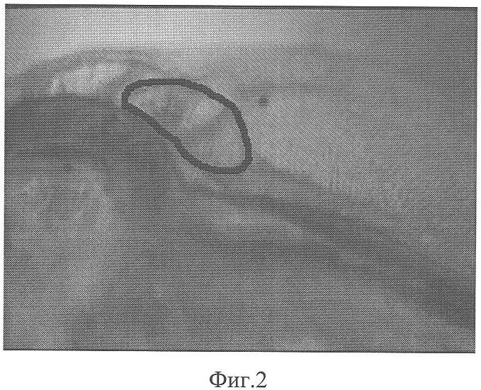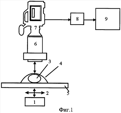 Источник света 1 фокусируют с помощью линзы 2 в область сердца дафнии 3, расположенной в тонком слое воды 4 на прозрачном столике 5 микроскопа 6. Дафнию (фиг.1) помещают на прозрачный столик 5 микроскопа с видеокамерой 7. Записывают увеличенное изображение сердца дафнии с помощью видеокамеры 7. Видеосигнал с камеры поступает через плату видеоввода 8 на цифровой носитель персонального компьютера 9. Осуществляют покадровую обработку последовательности видеокадров, для этого на каждом кадре выделяют границы сердца дафнии, с помощью алгоритма нахождения границ. Определяют площадь, ограниченную выделенными границами, путем подсчета отношения числа точек выделенного сердца дафнии к общему числу точек на изображении. Определяют зависимость площади на каждом кадре от времени, имеющую квазипериодический характер. Частоту сердцебиений определяют по величине среднего значения периода указанной зависимости, а амплитуду – по величине среднего значения амплитуды указанной зависимости.