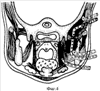 В нижней ране рассекают подкожно-жировую клетчатку, подкожную мышцу. Затем рассекают собственную фасцию шеи в верхнем отделе раны по переднему краю кивательной мышцы, а внизу раны – между нижним полюсом околоушной железы и поднижнечелюстной слюнной железой, при этом полностью сохраняется прикрепление капсулы поднижнечелюстной слюнной железы к нижнему краю нижней челюсти. Задненижний отдел околоушной слюнной железы вместе с капсулой отсекают от переднего края кивательной мышцы и от поднижнечелюстной слюнной железы. Околоушную слюнную железу приподнимают крючком кверху и кпереди, обнажают задний край ветви нижней челюсти. Рассекают по заднему внутреннему краю ветви нижней челюсти на длину 10-15 мм сухожилие медиальной крыловидной мышцы у крыловидной бугристости нижней челюсти, смещают медиальную крыловидную мышцу кнутри, расслаивая клетчаточное пространство между внутренней поверхностью ветви нижней челюсти и наружной поверхностью медиальной крыловидной мышцы, сохраняя прикрепление большей части медиальной крыловидной мышцы к нижней челюсти. Смещают задний край поднижнечелюстной слюнной железы кпереди и книзу, расслаивая жировую клетчатку по задневнутренней поверхности медиальной крыловидной мышцы кверху и кнутри, проникают в окологлоточное пространство. Проводят ревизию и эвакуацию гнойного отделяемого из крыловидно-нижнечелюстного и из переднего и заднего отделов окологлоточного пространства (фиг.2). Проводят хирургический зажим между наружной поверхностью медиальной крыловидной мышцы и внутренней поверхностью ветви нижней челюсти до медиальной поверхности скулового отростка височной кости, тупым путем соединяют верхний и нижний разрезы между собой с последующей антисептической обработкой и установкой перфорированной резиновой трубки для проточного дренирования глубоких клетчаточных пространств лица, которые также дополнительно дренируют трубчатыми и перчаточными дренажами (фиг.3, 4), накладывают повязки с левомеколем.