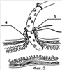 На фиг.1 изображено устройство для дренирования, общий вид. На дренажную трубку накладываются 2 лигатуры-метки. Одна в 3-4 см от кишечного конца затягивается до образования вдавления (1). Вторая метка накладывается у места выхода дренажа из печени (2). В 2,5-3 см проксимальнее печеночной метки на дренаже выполняются боковые отверстия на 1/3 диаметра трубки с частотой до 1-1,5 см друг от друга (3). Формируется петля тонкой кишки по Ру длиной не менее 60 см. На противобрыжеечном крае проксимального конца тонкой кишки иссекается серозно-мышечная пластинка диаметром до 0,5 см (фиг.2). Слизистая кишки вытягивается наружу в виде «дивертикула» (4). На верхушечную часть дивертикулообразного выпячивания накладывается кисетный шов. Через перфоративное отверстие «дивертикула» проводится дренажная трубка и кисетный шов затягивается на дистальной лигатурной метке (5), что предотвращает соскальзывание кисетного шва с дренажной трубки при подтягивании его с петлей кишки в просвет протока (фиг.3). Тракцией дренажной трубки в проксимальном направлении и фиксацией его слизистая кишки втягивается внутрь протока. Таким образом, слизистая кишки надежно фиксируется в просвете протока (6). Стенка кишки дополнительно подшивается 4-5 серозо-мышечными швами вокруг анастомоза к капсуле печени. Печеночный конец дренажа выводится через 3 или 5 сегмент печени на диафрагмальную поверхность, фиксируется и затем выводится наружу через переднюю брюшную стенку (фиг.4).