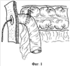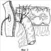 Фиг.1 – схема внедрения компрессионного устройства типа «скрепка» в подготовленные анастомотические площадки тонкой и толстой кишок.