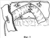 Вслед за этим треугольными швами зону анастомоза вместе с устройством погружают в поперечную ободочную кишку (Фиг.2). Одновременно с этим формируют подобие медиальной и латеральной уздечек, осуществляя тем самым ремоделирование илеоцекального отдела. Зону инвагинации укрепляют редкими серозно-мышечными швами (Фиг.3).