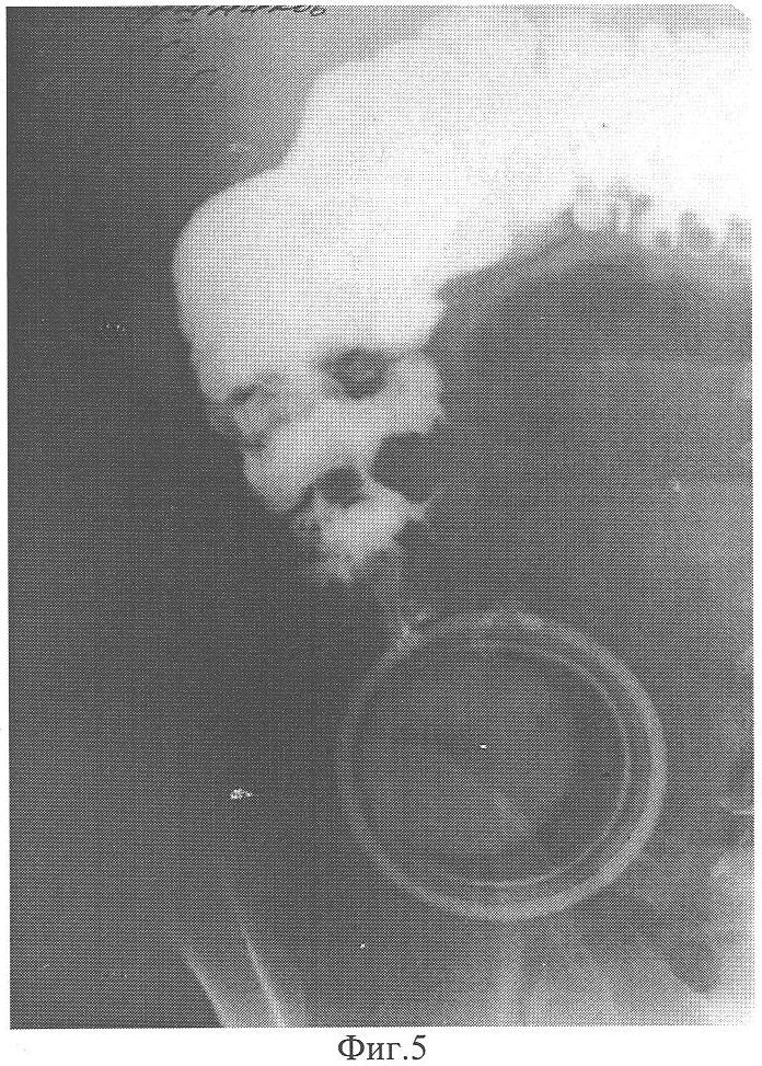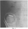 Фиг.4 – обзорная рентгенограмма больного Д., сформированный первично-отсроченный инвагинационный компрессионный тонко-толстокишечный анастомоз с применением компрессионного устройства типа «скрепка» из никелида титана.