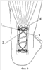Предлагаемый способ ахиллопластики выполняется следующим образом. Производят продольный разрез кожи длиной до 0,5-1 см в проекции ахиллова сухожилия. Выделяют ахиллово сухожилие. Рассекают фасциальную оболочку в продольном направлении на протяжении 0,5-1 см, выделяют субфасциально ахиллово сухожилие. Заряжают посередине сложенную вдвое нить в ушко тонкой иглы. Прошивают чрескожно проксимальную часть ахиллова сухожилия в поперечном направлении (с выходом чрескожно на противоположной стороне) с формированием сдвоенной петли 1 с одной стороны, петли 2 и свободных концов 3 нити с другой стороны (фиг.1). Продевают свободные концы 3 нити через петлю 2, осуществляют вкол иглой в предыдущее место вкола, проводят свободные 3 концы нити над сухожилием подкожно с их выходом через предыдущее место выкола, пропускают свободные концы 3 нити через сдвоенную петлю 1, подтягивают за свободные концы 3 нити с одной стороны и за петлю 2 с другой стороны с образованием подкожной сухожильной петли 4 по задней поверхности ахиллова сухожилия (фиг.2). После этого последовательно в ушко тонкой иглы заряжают свободные концы 3 нити и петли 2, производят вкол иглы с каждой стороны в предыдущее отверстие в коже, проводят свободные концы 3 нити и петли 2 за подкожной сухожильной петлей 4 в косопоперечном направлении с перехлестом в центре сухожилия и выходом иглы на противоположной боковой поверхности ахиллова сухожилия. Концы нити выводят в рану. Таким же образом накладывают шов на дистальную часть ахиллова сухожилия. После чего производят субфасциальное пересечение ахиллова сухожилия в косопоперечном направлении между местами выхода нитей из проксимальной и дистальной части ахиллова сухожилия. Выводят стопу в положение максимальной тыльной флексии. Подтягивают за концы нитей части ахиллова сухожилия друг к другу, восстанавливают физиологическое натяжение икроножной мышцы и сокращают диастаз между концами ахиллова сухожилия (фиг.3). Последовательно производят завязывание нитей с обеих сторон, погружают узлы в рану. Накладывают один узловой шов на рану. Осуществляют иммобилизацию гипсовой циркулярной повязкой конечности от верхней трети бедра со стопой в положении максимальной тыльной флексии стопы и сгибания в коленном суставе сроком на 3 недели.