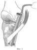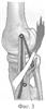 Изобретение иллюстрируется следующими фигурами: на фиг.1 изображены проекции кожных разрезов в медиальной области коленного сустава; на фиг.2 – проведение трансплантата; на фиг.3 – окончательный вид после пластики.