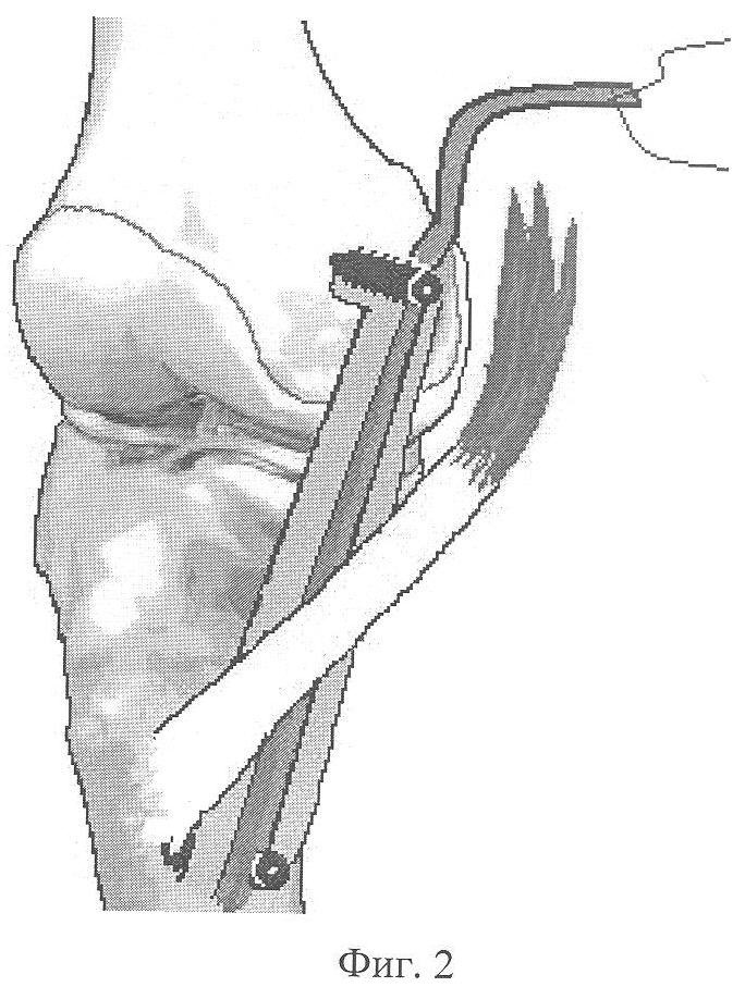 Указанный технический результат достигается тем, что в способе хирургического лечения хронической медиальной нестабильности коленного сустава, включающем выделение сухожилий полусухожильной и нежной мышц, отсечение от мышечного брюшка и прошивание их проксимально, формирование под артроскопическим контролем в средней трети медиальной поверхности коленного сустава паракапсулярно по спице с ушком канюлированным сверлом мягкотканого канала, в который проводят сухожилия и выводят через разрез в области приводящего бугорка медиального мыщелка бедренной кости, натяжение сухожилий и прошивание в том участке, который находится над разрезом, формирование горизонтального канала в медиальном мыщелке бедренной кости, погружение в канал прошитого участка сухожилий, фиксацию интерферентным винтом прошитой части сухожилий к мыщелку бедра при сгибании коленного сустава до 100° и внутренней ротации голени с формированием передней порции коллатеральной большеберцовой связки, проведение проксимальной части сухожилия нежной мышцы в сформированный мягкотканый канал по направлению сверху-вниз под сухожилием портняжной мышцы, фиксацию к медиальному мыщелку большеберцовой кости интерферентным винтом в состоянии натяжения при разогнутом коленном суставе без ротации голени позади передней порции сформированной связки, дополнительно в области приводящего бугорка бедренной кости формируют мягкотканый косой паракапсуллярный канал к заднемедиальной части медиального мыщелка большеберцовой кости, в который проводят проксимальную часть сухожилия полусухожильной мышцы по направлению сверху-вниз спереди-назад под сухожилием портняжной мышцы и фиксируют к заднему отделу медиального мыщелка большеберцовой кости интерферентным винтом в состоянии натяжения при сгибании коленного сустава до 100° и наружной ротации голени позади сформированной коллатеральной большеберцовой связки.