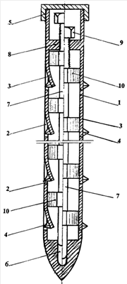 Наиболее близким по своему техническому решению заявляемому устройству является ножка эндопротеза тазобедренного сустава [2], принятая за прототип. Ножка выполнена в виде трубки с заглушенным нижним концом и отверстиями по боковой поверхности, с размещенными в них элементами крепления и стержнем с коническими кольцевыми выступами, установленным с возможностью осевых перемещений, при которых его конические выступы, представляющие собой толкатели, взаимодействуют со сферическими головками элементов крепления. При этом заостренные концы выступов внедряются в костную ткань. Элементы крепления подпружинены, чем обеспечивается их постоянный контакт с толкателями при любом положения взаимодействующих деталей. Однако при работе устройства не исключено заклинивание сферических головок элементов крепления на поверхности конических толкателей. Кроме того, гистерезис миниатюрных пружин, наступающий в результате их длительного сжатия в рабочем положении, сделает невозможным возврат в исходное положение элементов крепления при возникшей необходимости извлечения эндопротеза.