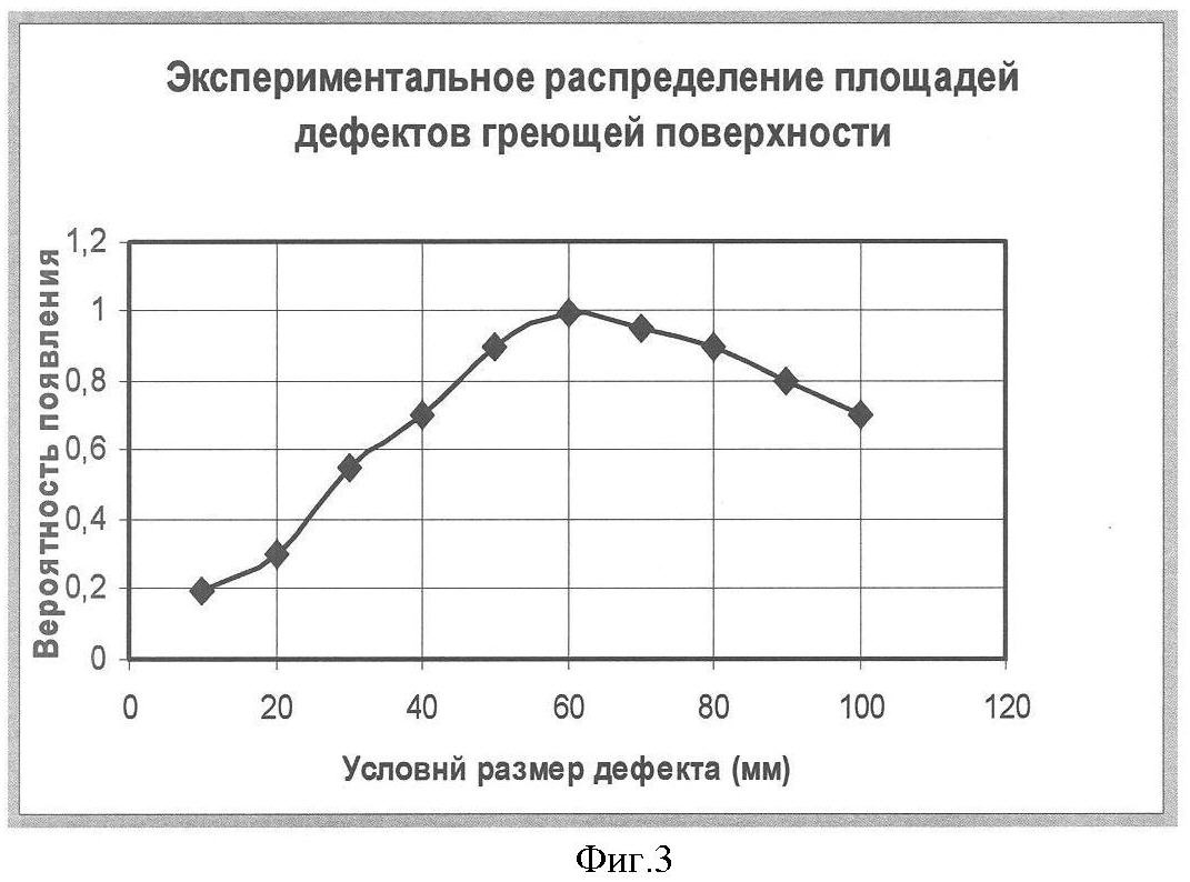 Экспериментальное распределение площадей локальных изменений температуры на контролируемой поверхности приведено на фиг.3.