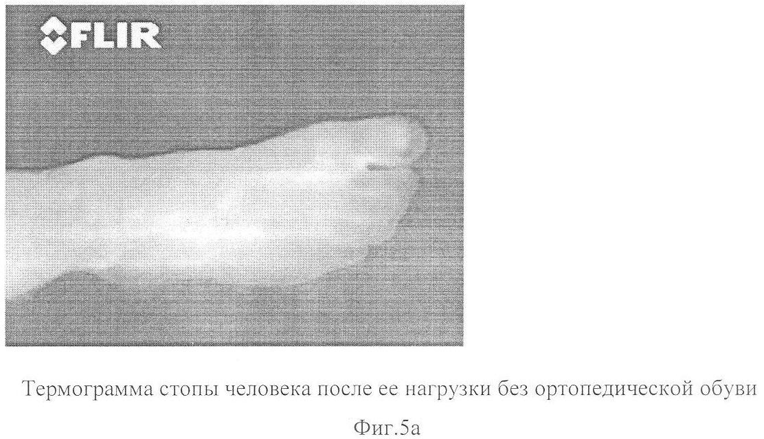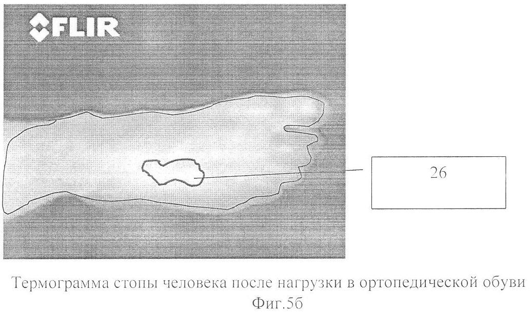 После выдержки стопы и второго нагружения, с надетой на ногу ортопедической обувью, зарегистрирована термограмма фиг.5б.