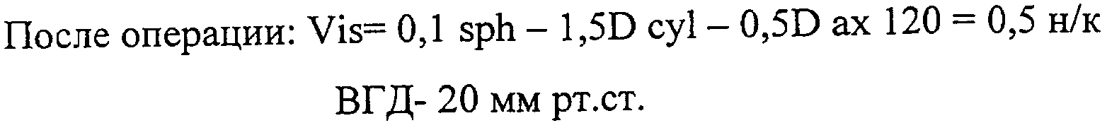 Изобретение относится к медицине, а именно к офтальмологии, и может быть использовано для предотвращения развития осложнений со стороны сетчатки при микрохирургических операциях по поводу катаракты у пациентов с сопутствующей патологией сетчатки макулярной области. Обычно всем пациентам, независимо от толщины сетчатки макулярной области, проводится традиционная ретробульбарная анестезия (РБА) или получившая в последнее время широкое распространение эпибульбарно-внутрикамерная анестезия (ЭВА). При РБА инъекция анестетика осуществляется в ретробульбарное пространство, при ЭВА – анестетик капельно (аппликационно) наносится на роговицу и добавляется к раствору вискоэластика, вводимого в переднюю камеру глаза (внутрикамерная анестезия). В литературе описано, что анестетик, вводимый ретробульбарно, отрицательно воздействует на сетчатку, что проявляется в виде утолщения макулярной области сетчатки, ответственной за центральное зрение. Как правило, утолщение сетчатки имеет преходящий характер с восстановлением исходных значений через 3-5 месяцев. Однако в контингенте больных с катарактой, которая сочетается с сопутствующей патологией сетчатки, проведение РБА может вызвать прогрессирование отека макулы, что является серьезным осложнением. Авторам не известны способы определения показаний к выбору метода анестезии при микрохирургических операциях по поводу катаракты при наличии сопутствующей патологии сетчатки макулярной области. Задачей изобретения является создание эффективного способа определения показаний к выбору метода анестезии при микрохирургических операциях по поводу катаракты при наличии сопутствующей патологи сетчатки макулярной области. Задача решается тем, что в способе определения показаний к выбору метода анестезии при микрохирургических операциях по поводу катаракты при наличии сопутствующей патологии сетчатки макулярной области производят определение толщины сетчатки макуляной области методом оптической когерентной томографии оперируемого или парного глаза при выраженном нарушении прозрачности оптических сред оперируемого глаза, и если толщина сетчатки превышает 300 микрометров, то показана местная анестезия переднего отрезка глазного яблока, состоящая из эпибульбарных инстилляций анестетика и внутрикамерного введения анестетика в сочетании с вискоэластиком. Авторами проведена большая научно-клиническая работа по изучению воздействия анестетиков на внутренние, наиболее реактивные структуры глаза, в том числе на сетчатку области макулы. Установлено, что минимально используемые концентрации анестетиков для аппликационной или внутрикамерной анестезии не вызывают изменения со стороны основных морфофункциональных систем глаза (роговица, цилиарное тело, радужка, дренажные пути, сетчатка). В то же время концентрация и количество используемого анестетика для РБА многократно превышает таковые параметры при ЭВА. Продолжительное депонирование анестетика у заднего полюса детерминирует ятрогенный эффект на чувствительную нейроглиальную ткань сетчатки и зрительного нерва. В литературе описаны случаи развития слепоты в результате прямого контакта анестетика с диском зрительного нерва. В этом же контексте следует рассматривать негативные изменения сетчатки в результа