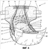 Для того чтобы слой 4 набивного материала обладал способностью быстро принимать большие количества жидкости, он имеет волокнистую структуру со сравнительно большими порами, то есть капиллярную структуру, которая обеспечивает возможность эффективного впитывания жидкости. Слой 4 набивного материала предпочтительно представляет собой слой типа волокнистой ваты, который может быть связанным или несвязанным и который может быть создан на основе синтетических или натуральных волокон. Посредством соответствующего выбора набивного материала также получают заданную структуру выпуклостей 23. Более точно, выбор волокон для слоя 4 набивного материала и их (его) плотности и эластичности или упругости определяет склонность набивного материала 4 к “поджиму” вверх в зонах вокруг прорезей 21 с тем, чтобы можно было образовать вышеупомянутые выступающие вверх выпуклости 23. Эластичность или упругость следует понимать как означающие то, что материал обладает способностью принимать (восстанавливать) или пытаться восстанавливать свою исходную толщину или высоту после сжатия. Для получения выпуклостей 23, которые являются высокими относительно уровня (высоты) остальной части верхнего листа 2, и, таким образом, также получения обособленных и больших отверстий, образованных прорезями 21, материал с особенно высокой упругостью может быть использован в набивном материале 4 в задней части 6 подгузника 1. Это будет подробно описано ниже.