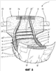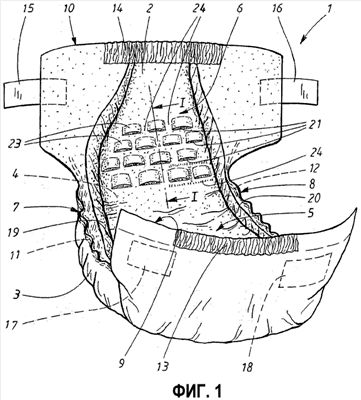 Настоящее изобретение будет описано далее со ссылкой на ряд предпочтительных вариантов осуществления, которые показывают различные типы поглощающих изделий в соответствии с изобретением. В соответствии с первым вариантом осуществления, который можно видеть на фиг.1, поглощающее изделие представляет собой подгузник 1 одноразового типа, предназначенный для младенцев. Подгузник 1 содержит первый покрывающий лист, образующий проницаемый для жидкостей, верхний лист 2. Данный верхний лист 2 расположен с той стороны подгузника 1, которая во время использования предназначена для того, чтобы быть направленной к человеку, носящему подгузник. Подгузник 1 дополнительно содержит второй покрывающий лист, образующий нижний лист 3, который во время использования предназначен для того, чтобы быть направленным от пользователя. Нижний лист 3 соответственно выполнен не проницаемым для жидкостей. Слой набивного материала 4 расположен под верхним листом 2. В соответствии с тем, что подробно описано ниже, верхний лист 2 и расположенный под ним набивной материал 4 образуют проницаемый для жидкостей и обеспечивающий перемещение жидкостей ламинат, который согласно изобретению используется, в частности, для приема неплотных и текучих экскрементов. Под набивным материалом 4 имеется поглощающее тело, которое не обозначено никакой ссылочной позицией на фиг.1, но будет описано ниже со ссылкой, в частности, на фиг.2.