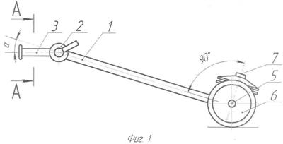 Трость берется за рукоятку 3 в левую или правую руку, колеса 6 опускаются на дорогу. Это – рабочее положение. Оценивается удобство расположения рукоятки 3. При необходимости, разжав винтовой зажим 2, корректируют ее расположение, изменяя угол отгиба . Потом начинается движение. При попадании одного из колес 6 в выбоину поперечина 4 перекашивается под действием силы тяжести. Этот перекос по штанге 1 передается на рукоятку 3, а она, будучи овальной в сечении, через тактильные ощущения пальцев и ладони сигнализирует об этой выбоине инвалиду, который реагирует на этот сигнал, сообразуясь со своим опытом.