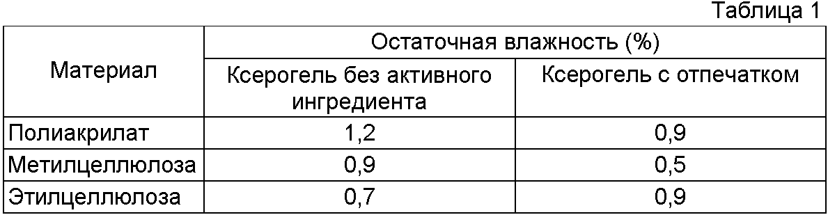 Ксерогели получают из гидрогелей, содержащих 2% желеобразующего агента посредством лиофильной сушки. Полученные ксерогели имеют по диаметру 2 см и в высоту 3 мм. 20 мкл состава разделяют на 400 капель по 50 нл. Капли размещают на расстоянии 1 мм друг от друга по геометрическому образцу 20х10 капель два раза последовательно.