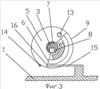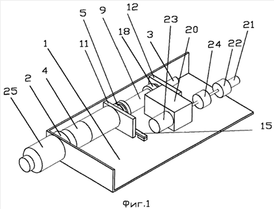 Привод вращения втулки может быть выполнен в виде шестерни 18, размещенной на втулке и входящей в зацепление с шестерней 19 (не показано), размещенной на выходном валу понижающего обороты редуктора 20 с большим передаточным числом. Вращение входного вала редуктора может осуществляться ручным и (или) электромеханическим приводом. Для ручного вращения используют ручку 21, расположенную напротив входного вала редуктора и вращающую его через фрикционное соединение 22. В качестве электромеханического привода используют электромотор 23. На входном валу редуктора расположен счетчик 24 числа оборотов со сбросом, который может быть как механическим, так и электронным.