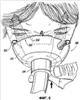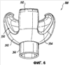 Корпус 310 выступает наружу от фланцевого элемента 314 и затем перегибается, заворачиваясь внутрь и вниз и образуя второе центральное отверстие 320, которое во время эксплуатации маски охватывает рот пациента. Кромка 322 корпуса 310 задает границы второго центрального отверстия 320, но вследствие того, что корпус 310 имеет перегибающуюся или завернутую форму, кромка 322 не является самой нижней частью корпуса 310. Самая нижняя часть 324 корпуса 10 формируется завернутым или подогнутым участком корпуса 310. Таким образом, первоначальный контакт лица пациента происходит именно с нижним участком 324, как видно из фиг.5, и в силу деформируемости корпуса 310 корпус деформируется и слегка сминается при попытке прижатия маски 300 к лицу. Как следует из фиг.5, в реальности самый нижний участок 324 маски 300 подвернут еще сильнее.