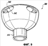 Маска в соответствии с первым вариантом исполнения, изображенная на фиг.3-5, имеет следующие размеры. Наружный диаметр корпуса 310 маски составляет около 77 мм, наружный диаметр фланца 314 – около 20 мм. Диаметр второго отверстия 320 – около 46 мм. Из фигур видно, что отверстия 330 имеют коническую форму, при этом наибольшая ширина отверстий – у внутренней кромки 334, а наименьшая – в месте смыкания отверстия 330 со вторым отверстием 320. В соответствии с одним вариантом исполнения ширина отверстия 330 у внутренней кромки 334 составляет около 20 мм при последующем сужении диаметра до приблизительно 10 мм в месте смыкания со вторым отверстием 320. Глубина отверстия 330 от внутренней кромки 334 до самой нижней части маски 324 составляет около 9 мм в состоянии покоя (см. фиг.3-4), когда же маска приложена к лицу во время введения препарата, глубина сокращается до приблизительно 5 мм.