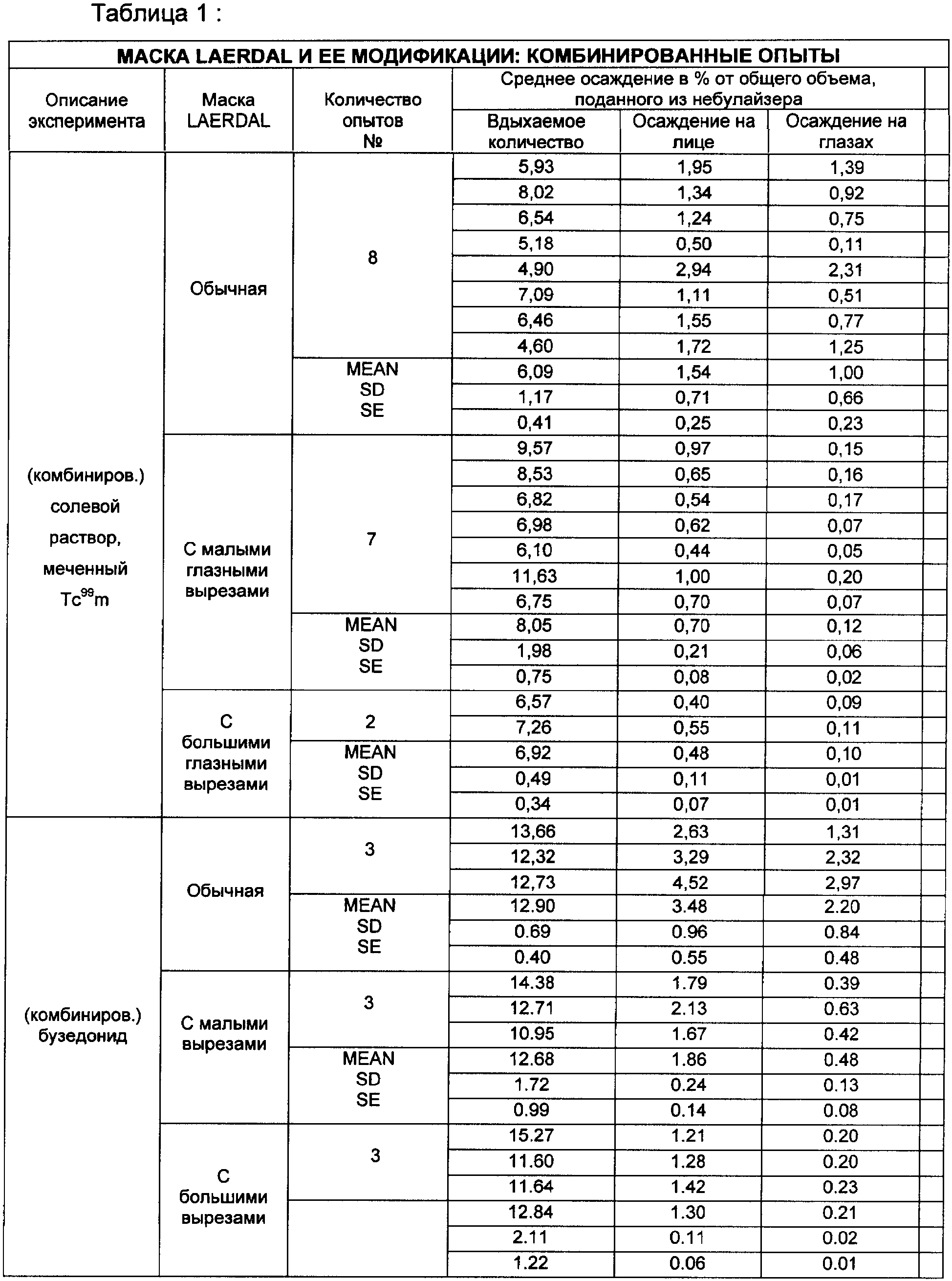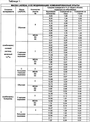 Второй эксперимент был проведен с использованием стероида будезонида в качестве аэрозольного препарата, а три описанных выше маски были использованы в составе небулайзерной системы. Как видно из данных, приведенных в таблице 1, при использовании с небулайзером обычной маски Laerdal в районе глаз пациента отмечено осаждение 2,20% от общего количества аэрозольного препарата (будезонида), предварительно помещенного в небулайзер (осаждение на лице составило 3,48%). Количество препарата, доставленного в дыхательную систему пациента, составило 12,90% от количества, помещенного в небулайзер.