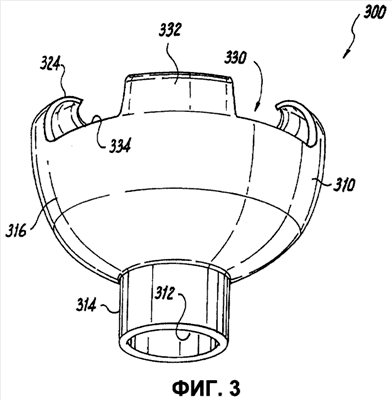 В одном из примеров реализации изобретения маска 300 изготовлена из эластичного полимерного материала. Продажи масок данного типа осуществляются компанией Laerdal, которая представляет данный продукт как детскую силиконовую маску для проведения реанимационных процедур. Такая маска 300 состоит из корпуса 310, который выполнен из эластичного полимерного материала и характеризуется скорее низкой сопротивляемостью сжатию, чем повышенной жесткостью конструкции. Таким образом, когда маска 300 размещается на лице пациента, корпус 310 маски слегка деформируется. Необходимо отметить, что маска 300 данной конструкции приведена в данной работе исключительно в иллюстративных целях, поскольку существует целый ряд моделей детских масок, изготовленных из гибкого материала, которые могут быть использованы в соответствии с настоящим изобретением. В корпусе 310 имеется первое центральное отверстие 312, задаваемое частично кольцевым фланцевым элементом 314, выступающим наружу от внешней поверхности 316 корпуса 310. Корпус 310 изготовлен из эластичного материала и поэтому легко деформируется или сжимается при приложении к нему силы во время размещения маски на лице пациента.
