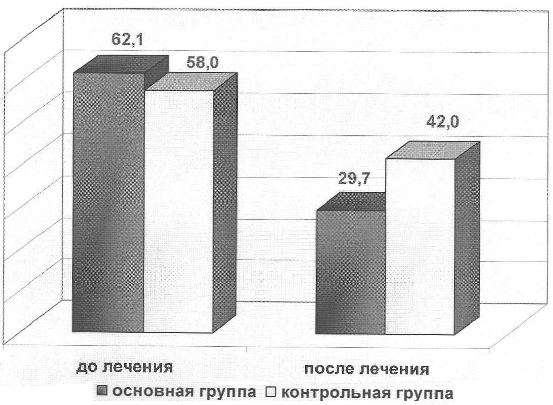 Скорость кишечного транзита в процессе лечения в обеих группах достоверно увеличивалась по сравнению с исходной, однако степень увеличения была достоверно больше в первой группе, по сравнению со второй (от 62,1±4,4 до 29,7±3,8 часа и от 58±3,8 до 42±4,2 часа, р<0,05).