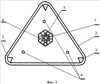 Предлагаемая игра осуществляется при помощи стола 1 треугольной формы с бортиками 2, покрытыми тканью, трех луз 3, центрального треугольной формы отверстия-лунки 4 в столе 1, заглушкой 5 и ножек 6. На поверхности стола установлено шестигранное средство 7 для придания формы шаров 8. Три шара 9 – битки каждого игрока. В нижней части стола установлены лотки 10 для сбора шаров 8 и 9.