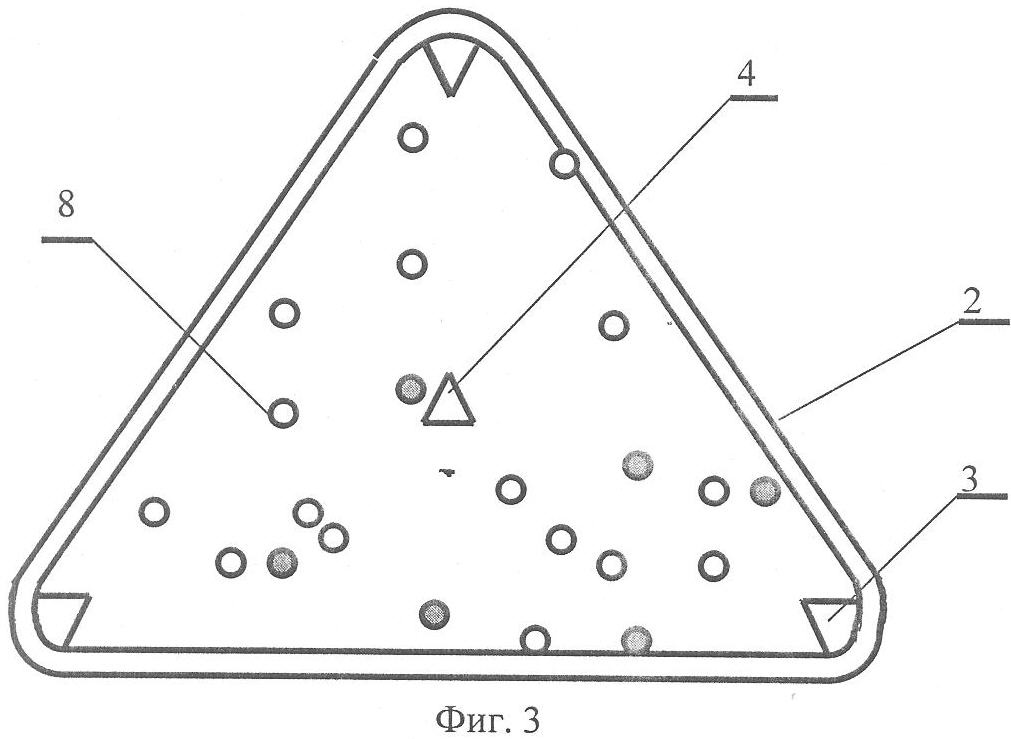 Исходное положение. Заглушка 5 установлена в треугольное отверстие – лунку 4 и закрывает его заподлицо с наружной поверхностью стола 1. До начала игры шары 8 (19 шт.) устанавливаются в полость средства 7 для придания формы шестиугольника, устанавливаемых на столе 1 шаров 8, а один шар, предусмотренный для каждого игрока, разбивающий (биток) 9, устанавливается невдалеке от каждого из углов треугольного стола 1. При установке шаров 8 в полость средства 7 для придания формы шарам 8 в центре устанавливается, например, шар 8 черного цвета, по периметру которого устанавливается 6 (шесть) шаров, например, белого цвета. Средство 7 для придания формы шарам ориентируют углами в сторону луз 3. Цвета шаров могут быть не только белыми и черными, но и серыми и красными и самыми различными. По периметру шести белых шаров устанавливаются шары черного цвета (12 шт.). Осуществляется разбивка шаров 8 поочередно каждым игроком битками 9 белого цвета. После разбивки шаров 8 заглушку 5 извлекают из треугольного отверстия 4, и начинается, в соответствии с установленными правилами, игра. При этом, как только шар попадает в створ треугольных прорезей у луз 3 или у центрального треугольной формы отверстия-лунки 4, грани прорезей направляют этот шар непосредственно в лузу 3 или в центральное отверстие-лунку 4, поэтому во время игры повышается ответственность за точный расчет при каждом очередном ударе.