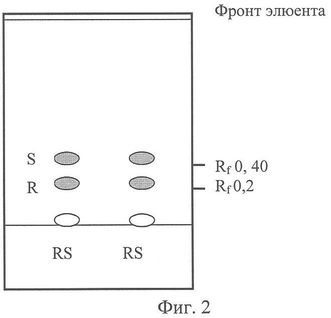 Затем на хроматографической пластине проводят линию старта и наносят на нее капли раствора бензолсульфоната амлодипина. Пластину с нанесенным рацематом помещают в камеру и выдерживают в закрытой камере, пока фронт подвижной фазы не достигнет линии финиша. Пластинку вынимают из камеры и высушивают до полного удаления подвижной фазы.