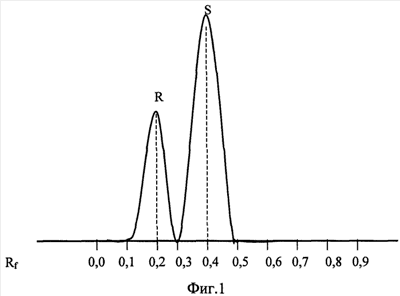 Результаты разделения рацемата на R и S энантиомеры представлены в виде денситограммы, приведенной на фиг.1, и в виде хроматограммы, представленной на фиг.2.