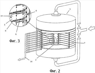Как показано на фиг.2, нефильтрат течет по соответствующим подающим трубопроводам 1 к центральной распределительной трубе 2, находящейся внутри фильтра, при этом нефильтрат с целью улучшения условий обтекания подается в фильтр 3 как со стороны верхнего, так и со стороны нижнего его конца.