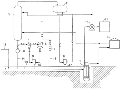 1 – резервуар для извлечения; 10 – воздуходувка; 11 – устройство для обработки отходов (газа); 12 – трубопровод подачи для негорючего газа; 13 – наклонная сборная труба; 14 – донная выпускная труба; 15 – донная выпускная труба; 16 – донная выпускная труба; 17 – донная выпускная труба; 2 – перегонная колонна; 3 – смотровое стекло; 4 – фильтр; 5 – насос; 6 – камера для отбора проб; 7 – резервуар для хранения; 8 – сливной бак; 9 – резервуар.