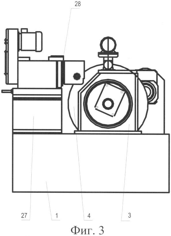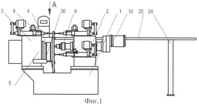 На основании 1, в позиции загрузки, дополнительно смонтированы: с одной торцевой стороны барабана устройство 24 подачи прутка 25 вдоль оси вращения 5 барабана 4, с другой стороны – упор 26 для ограничения осевого перемещения прутка 25 во время загрузки, а на дополнительной стойке 27 – фрезерная головка 28 для отрезки прутка 25. На позициях обработки на стойках 2 и 3 смонтированы упоры 29 для коррекции расположения торцов обрабатываемых деталей 7 при базировании на разных позициях обработки, а также на позиции выгрузки смонтирован выталкиватель 30 обработанных деталей 7.