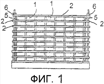 Комбинацию из обрабатывающих элементов 2 и древесины или древесных материалов фиксируют так, чтобы древесина или древесные материалы, размещенные в пространствах для прессования, оставались под действием сжимающих сил между обрабатывающими элементами 2. В зафиксированном положении обрабатывающие элементы 2, как правило, смещены к определяющим толщину упорам 5. Фиг.1 показывает схематическое изображение комбинации из обрабатывающих элементов и лесоматериала, используемых в способе согласно изобретению, в зафиксированном положении. Обрабатывающие элементы зафиксированы на месте посредством фиксирующих устройств 6, что создает возможность перемещения комбинации из обрабатывающих элементов и лесоматериала в сушильную камеру. Фиксирующие устройства 6, как правило, представляют собой механические фиксирующие устройства.