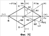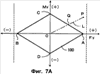Фиг.7А и 7В – виды, иллюстрирующие порядок вычисления целевой силы Fvt торможения/движения транспортного средства после модификации и целевого момента Mvt вращения транспортного средства после модификации в случае, когда целевая сила Fvn торможения/движения транспортного средства и целевой момент Mvn вращения транспортного средства выходит за пределы диапазона, достигаемого при управлении силами торможения/движения колес в первом варианте реализации настоящего изобретения.