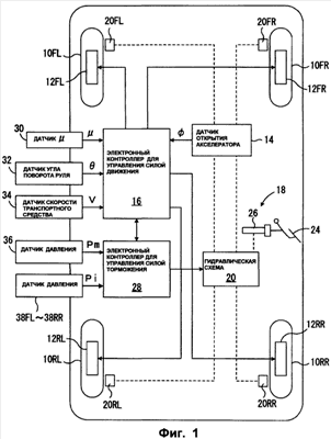 В приведенном первом варианте реализации настоящего изобретения средствами привода колес являются электродвигатели-генераторы 12FL-12RR, установленные на каждом колесе. В случае, когда целевые силы Fwxti торможения/движения колес принимают отрицательные значения, означающем, что эти силы являются силами торможения, используются силы регенеративного торможения, создаваемые электродвигателями-генераторами 12FL-12RR. Соответственно энергия движения транспортного средства может быть эффективным образом возвращена в виде электрической энергии при торможении для замедления, при одновременном достижении силы торможения/движения и момента вращения, необходимых транспортному средству, которые максимально возможны в пределах диапазона сил торможения/движения, которые могут быть созданы колесами.