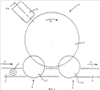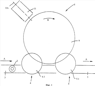 Более детально описана этикетировочная машина 1 такого вращательного типа, то есть она имеет, среди прочего, на станине 8 машины, установленной посредством нескольких ножек 6 на основании или на полу 7, приводимый во вращение вокруг вертикальной оси машины в направлении стрелки В ротор 9, по периметру которого известным специалисту способом выполнено несколько площадок, на которые соответственно на вход 4 бутылок по одной передаются бутылки 2 и на которых бутылки 2 во время процесса этикетирования удерживаются с помощью предусмотренного над каждой площадкой пуансона 10 посредством зажима между этим пуансоном и площадкой.