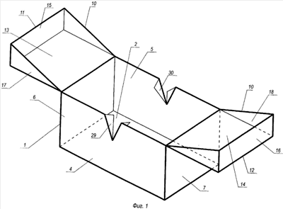 Коробка для пакетированных продуктов состоит из корпуса 1, образованного из днища 2 с соединительными элементами 3, передней 4, задней 5 и двух торцевых стенок 6 и 7 соответственно с соединительными элементами 8 и 9. Откидная крышка 10 выполнена из двух створок 11 и 12, каждая из которых шарнирно соединена соответственно с торцевой стенкой 6 и 7 корпуса 1 и взаимофиксирующихся при совместном закрывании коробки. Каждая из створок 11 и 12 имеет лоткообразную форму и соответственно содержит верхнюю стенку 13 и 14, соединенную соответственно с торцевыми 15 и 16 и боковыми 17 и 18 стенками створок 11 и 12. Каждая из боковых стенок 17 и 18 выполнена в форме треугольника. Торцевые стенки 15 и 16 створок 11 и 12 выполнены соответственно с бортиками 19, 20 и 21, 22, а боковые стенки 17 и 18 створок 11 и 12 выполнены с бортиками 23, 24 и 25, 26. Передняя 4 и задняя 5 стенки корпуса 1 выполнены с прорезями 27 и 28, расположенными посредине их верхних кромок и образующими по V-образным линиям М и N сгибов отверстия треугольной формы со свободно отогнутыми упорами 29 и 30 аналогичной формы. Линия М сгиба выполнена перпендикулярной гипотенузе боковой стенки 18 створки 12 откидной крышки 10 в ее закрытом положении, а линия N сгиба выполнена перпендикулярной гипотенузе боковой стенки 17 створки 11 откидной крышки 10 в ее закрытом положении. Такое выполнение линий М и N сгиба позволяет беспрепятственно входить створкам 11 и 12 в соответствующие прорези 27 и 28. Глубина Р прорезей 27 и 28 соответствует высоте Н торцевых стенок 15, 16 створок 11 и 12. Упоры 29 и 30 предназначены для освобождения зоны закрывания створок 11 и 12 откидной крышки 10 от содержимого коробки, в частности от пакетиков. Для обеспечения повышения надежности фиксации крышки в закрытом состоянии коробка выполнена из упругодеформируемого материала, например картона.