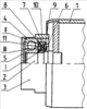 Собирают уплотнительное устройство 6 узла подшипника 3: во втулку с буртиком 7 вставляют с упором в буртик дополнительную мембранную шайбу 9 выпуклой стороной к ролику, затем установочную втулку 10, которую торцом устанавливают на дополнительную мембранную шайбу 9, при этом одна из сторон контактирует с втулкой с буртиком 7, затем втулку с фланцем 11 устанавливают на внутреннюю сторону дополнительной мембранной шайбы 9, при этом между фланцем втулки 11 и установочной втулкой 10 образуется минимальный зазор, далее на втулку с фланцем 11, параллельно дополнительной мембранной шайбе 9 через установочную втулку 10 (последняя выполняет роль распорки между мембранными шайбами) устанавливают мембранную шайбу 8, которая внешней частью закрепляется между установочной втулкой 10 и наружной обоймой подшипника 5, внутренней частью контактирует с внутренней обоймой подшипника 5.
