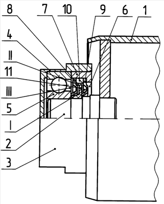 Далее в корпус 4 узла подшипника 3 вставляют подшипник 5 и запрессовывают втулку с буртиком 7 со вставленными в нее деталями, как это описано выше, т.е. уплотнительное устройство 6, получая узел подшипника 3. Внутри узла подшипника 3 образуется замкнутая полость для смазки, которая делится на три сообщающихся части I, II, III, при этом частички пыли и грязи, попадая от корпуса ролика 1 в часть I замкнутой полости со смазкой, в основном, задерживаются в ней, частично проникая в часть II, и практически не доходят до части III, что создает возможность повышения ресурса работы подшипника.