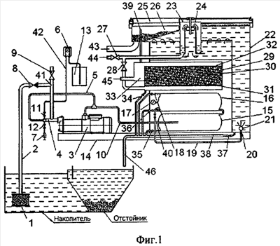 Если нет необходимости в глубокой очистке, то очищенная вода после флотации сбрасывается через кран 27 и патрубок 44. Все емкости установки имеют сливные краны 34, 35, 36, 37, объединенные единым трубопроводом 38, оканчивающимся патрубком 46. Электрическая и гидравлическая схемы установки обеспечивают ее работу в автоматическом режиме в соответствии с потреблением оборотной воды для мойки автомобилей либо по мере поступления сточных вод с помощью датчиков минимального и максимального уровней воды в емкости. Вода, очищенная флотационным способом, поступает через переливную трубу 24 в оголовок 23 и далее через кран 28 на глубокую очистку в засыпной встроенный фильтр 29.