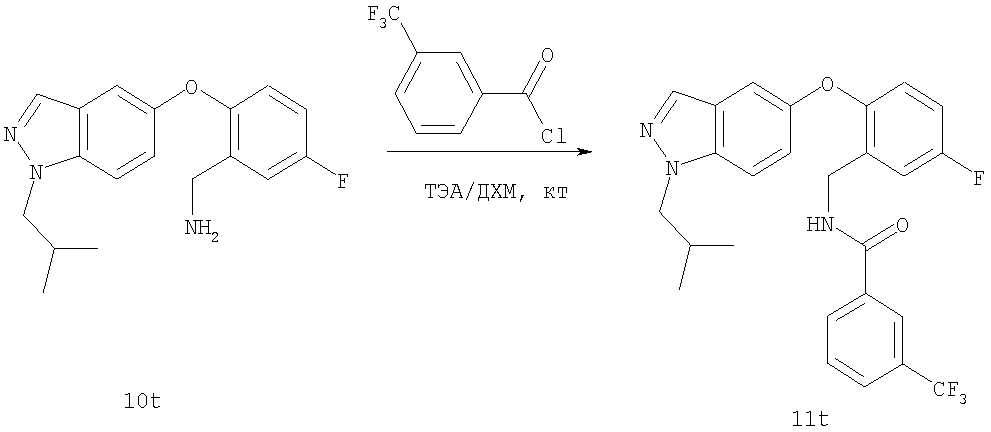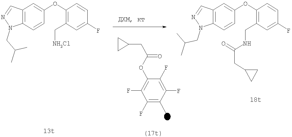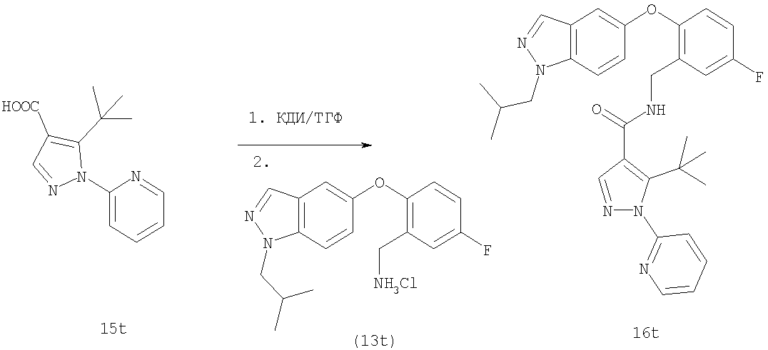 Стадия Е: 1-(5-трет-Бутилизоксазол-3-ил)-3-[5-фтор-2-(1-изобутил-1Н-индазол-5-илокси)бензил]мочевина. К охлажденному (0°С) раствору 5-фтор-2-(1-изобутил-1Н-индазол-5-илокси)бензиламина (0,364 г, 1,04 ммоль) и ДИЭА (0,5 мл, 2,08 ммоль) в дихлорметане (10 мл) добавляли трифосген (0,131 г, 0,374 ммоль). Смесь перемешивали при 0°С в течение 1 часа и затем перемешивали при комнатной температуре в течение 18 часов в атмосфере N2. Реакционную смесь концентрировали при пониженном давлении и суспендировали в дихлорметане (10 мл) с получением 0,123 М раствора. 0,4 мл этого раствора (0,015 г, 0,048 ммоль) обрабатывали 5-трет-бутилизоксазол-3-иламином (0,008 г, 0,053 ммоль). Продукт получали с выходом 44%. МС (ХИАД+), обнаружено: m/z 480 (М+1).
