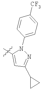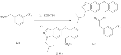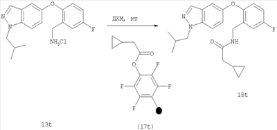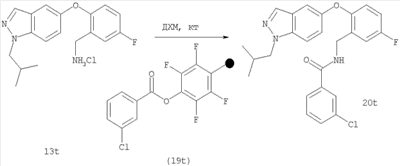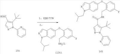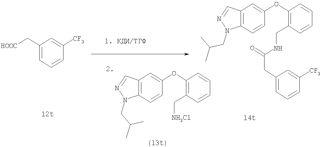 Стадия F: трет-Бутиловый эфир 4-[2-(5-{2-[3-(3-трет-бутилизоксазол-5-ил)уреидометил]-4-фторфенокси}индазол-1-ил)этил]пиперазин-1-карбоновой кислоты. Раствор трет-бутилового эфира 4-{2-[5-(2-аминометил-4-фторфенокси)индазол-1-ил]этил}пиперазин-1-карбоновой кислоты (0,050 г, 0,107 ммоль) в дихлорметане (2 мл) обрабатывали 4-нитофениловым эфиром (3-трет-бутилизоксазол-5-ил)карбаминовой кислоты (0,081 г, 0,266 ммоль) и перемешивали при комнатной температуре в течение 24 часов. Смесь разбавляли этилацетатом (60 мл), промывали 1 н. NaOH (5 мл), водой (2×10 мл), рассолом, сушили над MgSO4 и концентрировали при пониженном давлении. Остаток подвергали хроматографии, элюируя смесью ацетон/гексаны (2:3, затем 1:1) и получая 0,056 г продукта (выход 83%).