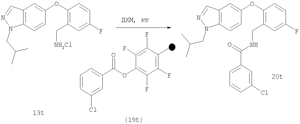 Стадия С: 1-(3-трет-Бутилизоксазол-5-ил)-3-{2-[1-(2-диметиламиноэтил)-1Н-индазол-5-илокси]-5-фторбензил}мочевина. Раствор {2-[5-(2-аминометил-4-фторфенокси)индазол-1-ил]этил}диметиламина (0,020 г, 0,061 ммоль) в ДМФА (1 мл) обрабатывали 4-нитрофениловым эфиром (3-трет-бутилизоксазол-5-ил)карбаминовой кислоты (0,020 г, 0,067 ммоль) (полученным согласно Примеру 136, стадия Е). Смесь перемешивали при комнатной температуре в течение 18 часов в атмосфере N2. Реакционную смесь подвергали хроматографии, элюируя смесью дихлорметан/эфир (10:1), а затем 5% МеОН в дихлорметане и получая 5,3 мг бледно-желтого масла (выход 18%). МС (ХИАД+), обнаружено: m/z 495 (М+1). 1Н-ЯМР (400 МГц, ДМСО-d6) 10.14 (s, 1H), 7.98 (s, 1Н), 7.74 (d, 1H), 7.22 (d, 1H), 7.16 (m, 2H), 7.08 (m, 1Н), 6.88 (m, 2Н), 5.93 (s, 1H), 4.48 (t, 2H), 4.35 (d, 2H), 2.70 (t, 2H), 2.17 (s, 6Н), 1.23 (s, 9H).