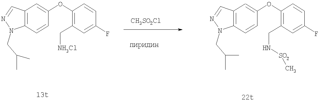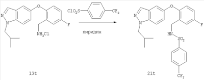 Стадия D: 5-Фтор-2-(1-изобутил-1Н-индазол-5-илокси)бензиламин. К раствору 5-фтор-2-(1-изобутил-1Н-индазол-5-илокси)бензонитрила (3,05 г, 9,86 ммоль) в МеОН (50 мл), подвергнутому азотной продувке, добавляли концентрированную HCI (1,6 мл) и Pd(OH)2/C (15 мас.%, 0,457 г). Смесь перемешивали при комнатной температуре в течение 18 часов в атмосфере Н2. Катализатор удаляли фильтрацией и раствор концентрировали при пониженном давлении, получая 3,32 г бледно-желтой пены (выход 96%).